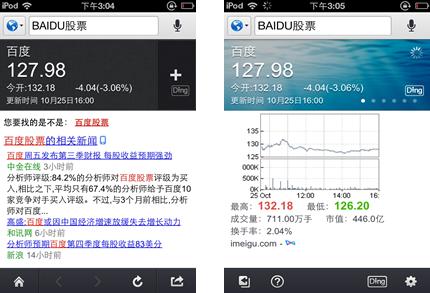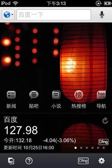(百度搜索结果 Ding功能展示) 除了语音搜索,百度Ding也是一项传言已久的功能。百度Ding对百度数据开放平台中一些大家常搜的信息进行了整合,比如天气、小说、股票等。从字面意思来看,Ding也是钉子的钉,隐喻着可以把结果钉到软件首页上,所以取名Ding。更有意思的是,记者发现这些信息在搜索结果中出现后,有一个加号,点了下加号后,应用的首页就有了刚才搜的信息,点开以后还有更详细的信息。 细节设计精美 彰显个性