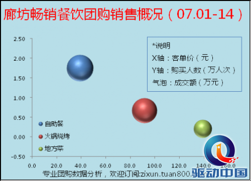 近两周以来,廊坊餐饮团购市场最为畅销的三大品类分别为自助餐、火锅烧烤和地方菜,共计开团696期,购买人数接近4.2万人次,成交额达200.1万元,占餐饮类团购总成交额的81.0%,市场占有率超过八成。在以上三个品类中,自助餐人均消费金额最低,仅为38.9元,参团人数及成交额均列榜首,分别为1.8万人次和69.0万元。其中,柏尔森烤肉自助餐厅“原价48元,现价39.9元单人自助餐午餐券”,两周内共在窝窝团售出2518份,成交金额超过10.0万元。