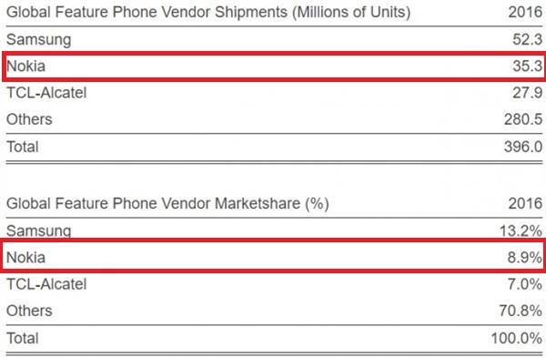 而在2016年,诺基亚在功能机市场的占有份额为8.9%,仅次于三星13.2%,排名第二。