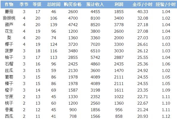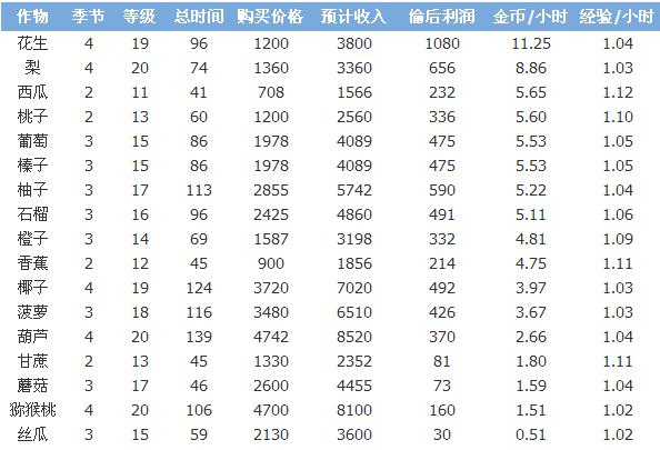 从上表可以得出:在被偷后,11级到20级作物当中,种植19级作物花生每小时所赚的金币最多,为:11.25,其实为20级作物梨,再次是11级作物西瓜,玩家可根据当前等级并结合上表来选择哪种作物种植。