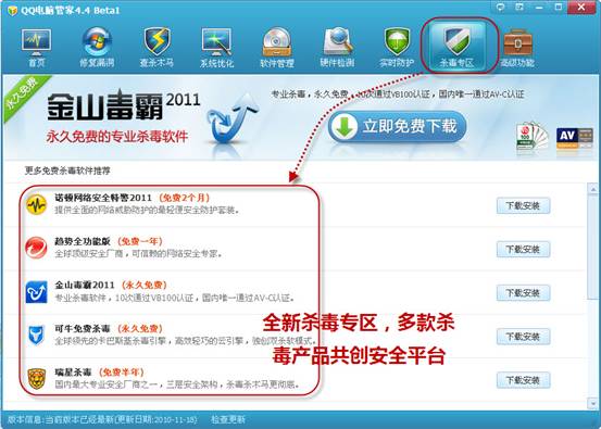 在QQ电脑管家4.4beta1中,原本在“高级功能”里低调呈现的杀毒专区以全新面貌高调复出。不仅在导航栏单独列出,更提供了包括卡巴斯基、小红伞、金山、趋势、瑞星等国内外多款专业免费杀毒软件供用户自由选择下载。(图1)