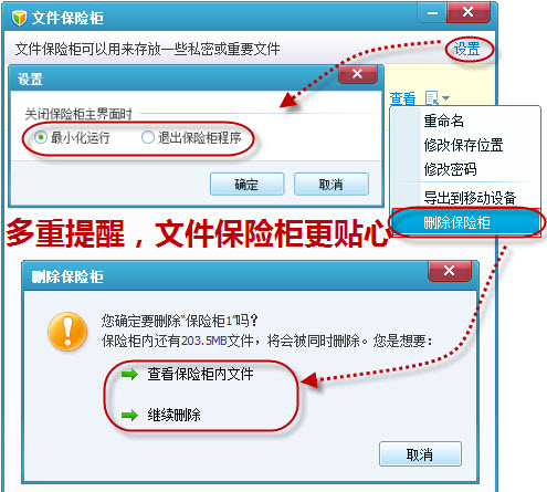 QQ电脑管家在4.3版中创新推出的文件保险柜功能,为我们的重要私密文件打造个人专属保险柜。在4.4beta1中,文件保险柜优化了新建首页界面,并在主界面增加关闭设置项,可自由选择关闭保险柜界面是退出保险柜主程序还是将主程序最小化到托盘区运行。而在删除保险柜时,为了防止意外删除重要文件,QQ电脑管家更提供查看保险柜内容入口,贴心保护用户隐私。(图2)
