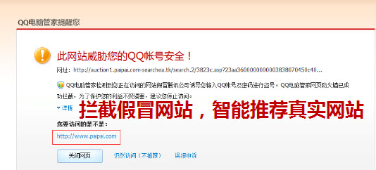 近年来颇为猖獗的钓鱼网站也被纳入了QQ电脑管家4.4beta1的信息安全防护体系。当要访问的网站含有恶意信息时,QQ电脑管家会主动拦截该网站,并智能推荐真实的官方网站。(图3)