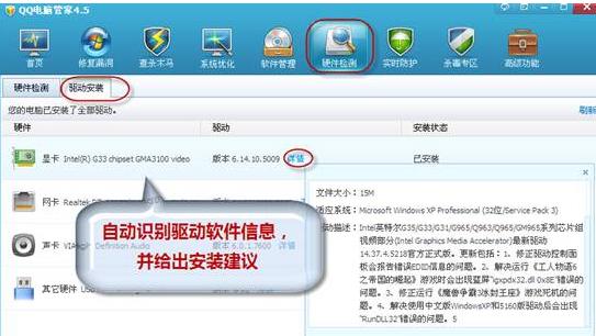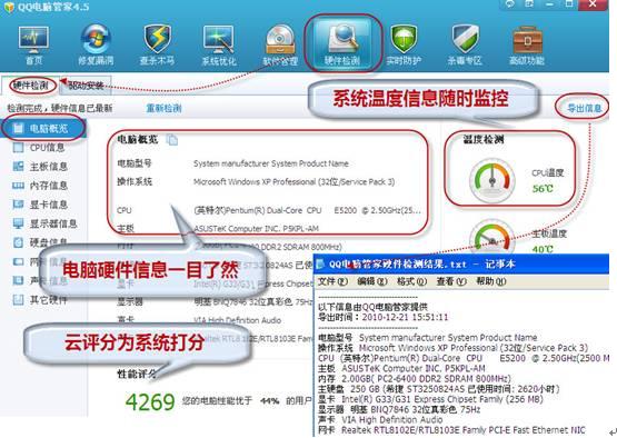 三年前的电脑现在运行地慢了,想换个新机器吧,无奈通胀时代荷包瘪瘪,只更新部分硬件比较划算。用QQ电脑管家的硬件检测、硬件驱动和系统加速功能让“老“电脑焕发青春活力,不再慢吞吞,运行更给力! 电脑加速第一步:硬件检测 若干年前买的电脑,运行越来越慢,对于很多菜鸟,甚至都不知道是哪里出了问题,用QQ电脑管家的“硬件检测”功能,就可以详细了解到电脑硬件安装情况了,同时还能得知系统运行的温度,如温度过高则需安装降温系统;此外,QQ电脑管家创新的智能云评分能为系统打分,根据电脑的各项特性,在云服务器上为电脑性能打分,与服务器上的海量用户电脑进行比较。我们可以根据系统的打分,直观了解自己电脑的状况,点击“导出信息”还可以把硬件信息的文本信息导出,以备随时查看。(图1) ![]()