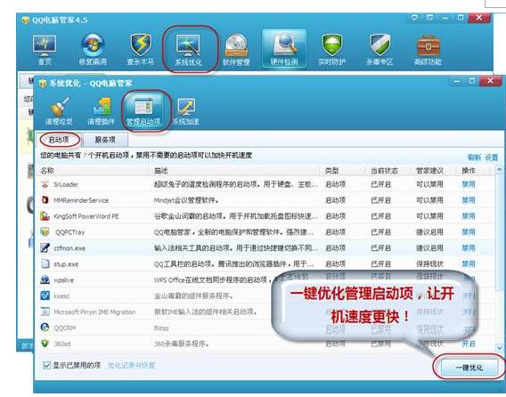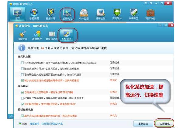 开机速度提升固然重要,电脑运行过程中的任务切换速度也不容忽视,利用QQ电脑管家系统优化选项中的系统加速功能,根据提示,选择优化系统中可优化的项目,从根本上优化了运行速度,电脑无论是开机关机还是切换任务,速度都有大幅度的提高。(图5) ![]()