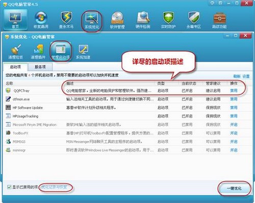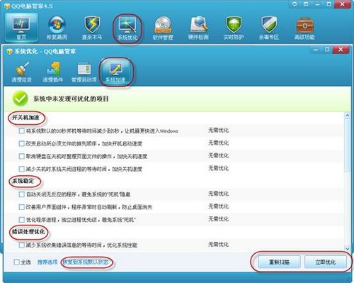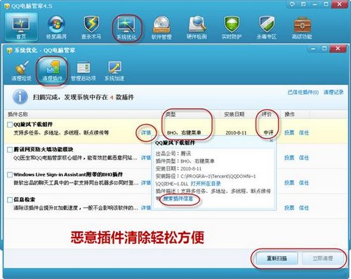 在对付通货膨胀的各类招数中,网购领域的"秒杀"一直保持着较高人气。而在通往功力深厚、技艺超群的"秒客"的修炼道路上,花样繁多的秒杀秘笈着实让人看得眼花缭乱。office秒杀达人Cherry对此有自己的独特见解:秒杀成功的根基应该是拥有一台始终保持高效运行的电脑。而以"全方位管理电脑"著称的QQ电脑管家拥有清理垃圾、插件,管理启动项,系统加速,开机助手等诸多妙招,招招犀利,电脑症结轻松"秒杀"。 横扫千军--轻轻松松垃圾、插件去无踪 Cherry表示自己有定期清理回收站的好习惯,但隐藏在系统角落里的垃圾清理起来既麻烦又繁琐,而安装程序软件、浏览网页时,总会有捆绑插件的情况,稍不留意就会安装不必要的插件,拖慢电脑运行速度。对付系统垃圾和插件,Cherry用QQ电脑管家就可以轻松搞定。 QQ电脑管家系统优化功能里的"清理垃圾",能全方位地为我们清理隐藏在系统"深处"的磁盘以及注册表垃圾,轻松铲除平时上网所造成的垃圾文件。除此之外,QQ电脑管家同时还提供系统注册表还原,全面保护电脑的高效运转,而在产品设计上众多功能采用一键式操作,清理更全面,服务更周到,系统垃圾去无踪。(图1) ![]() (什么叫高亮提醒) 除了为我们提供全面的系统垃圾清除服务外,QQ电脑管家在清理系统插件也有其独到之处,提供了系统插件的类型描述。基于云数据库的插件评价,详尽的插件描述,帮助用户准确、高效地辨认出恶意插件,插件清除轻松方便。(图2) ![]() 旋风掌--我的启动项我做主 电脑启动项和服务项过多也会大大增加不必要的开机时间。在这一点上,QQ电脑管家早就为我们想好了解决方案,系统优化功能为我们提供了全方位的启动项管理服务。点击运行该功能后,QQ电脑管家能够自行扫描系统启动项并给出最佳选择建议,同时提供一键优化按钮,最大程度地方便用户快速优化系统启动项和服务项,大大提升开机速度。(图3) ![]() 凌波微步 -- 系统运行加速度 对于秒杀达人Cherry来说,提高系统运行速度可以极大地提高秒杀成功率,是终极秘笈中的必杀技。QQ电脑管家的系统优化功能同样提供了让人惊喜的系统加速服务,开关机加速、系统稳定、系统错误处理优化,文件系统优化、网络安全与速度优化、速度优化,对电脑系统加速问题提供了全范围的提升服务,通过点击系统加速功能,QQ电脑管家自动扫描电脑中需要优化的项目,在用户自行选择需要优化的项目后,点击"立即优化"功能按钮,轻松即可实现系统的全范围优化。值得一提的是,对于优化不满意的项目,用户还可恢复到系统默认状态。(图4) ![]() 降龙十八掌--开机状况一清二楚 Cherry因QQ电脑管家的开机助手操作简明和"出招"有效将其形容为"降龙十八掌",每次开机之后,开机小助手的弹窗会自动出现在电脑桌面右下方,向用户清晰明了地展示本次开机过程中所花费的时间,同时还为用户展示系统加载时间以及启动项加载时间。 值得一提的是,QQ电脑管家开机助手除了提醒用户时刻关注电脑系统的运行状况以外,还提供了便捷的系统优化通道,用户只需点击开机助手页面上的系统加速和管理启动项即可分别进入相应页面进行系统优化。每天花短短的时间,就能大大提升系统运行速度,轻松享受秒杀快感。(图5) ![]() 据了解,除了上述各项便捷高效的系统优化功能,QQ电脑管家还提供了包括5种防护手段在内的立体化电脑防护体系,从根本上保护用户电脑的安全。听了cherry的介绍,"秒杀"达人们心动了吧?那就快快跟上,用QQ电脑管家"秒杀"电脑困扰,用运行良好的电脑去完成高难度的网购秒杀,真正对抗通胀压力!