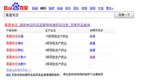 用户在百度搜索药品,可以通过对通俗的商品名、专业的药品名、批准文号等多个途径,得到权威准确的药监局认证药品数据。相比此前网络上鱼龙混杂未经认证的药品搜索结果,百度相当于为每种药品提供了一个“身份证”。比如网民在百度输入“氯雷他定”,相应的胶囊、糖浆、颗粒等都会展现出来;而搜“白加黑”,搜索结果会自动导引到“氨麻苯美片”。