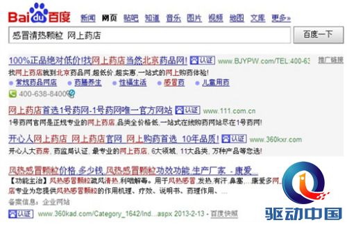 同时,经国家药监局备案的网络药店认证信息也入驻百度,百度搜索以醒目的认证标识推荐有网络售药资质的药店。当网民在百度搜索“药品名+网上药店”,或直接搜索某药店名称时,只要认准“认证”标识便可进入药监局权威认证的正规药店,可以放心购药。