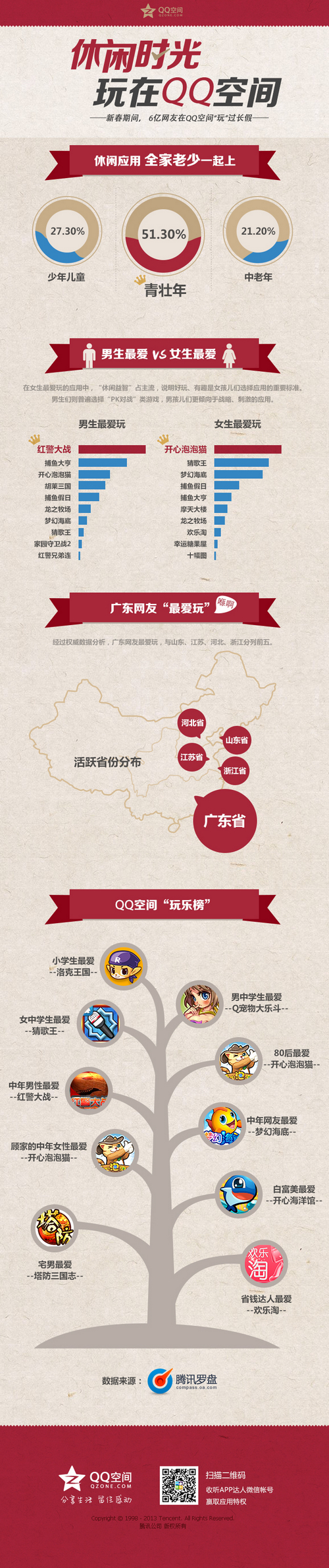 3月8日,QQ空间对外发布首张应用中心信息图——“休闲时光 玩在QQ空间”。据悉,春节期间共有6亿网友“玩”在QQ空间。来自腾讯罗盘的数据显示,女生更加偏爱“休闲益智”类应用、男生更加偏爱“PK对战”类应用;在全国32个省(自治区、直辖市)中,广东网友最爱“玩”;活力四射的80后最爱开心泡泡猫、睿智的中年男性最爱红警大战。