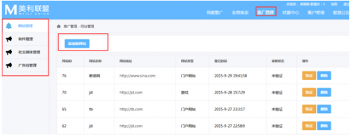 点击“推广管理“,然后即可进入网站的管理,用户可根据自己的实际情况,添加可加入美利联盟的广告素材的网站或其他推广渠道(如下图所示)