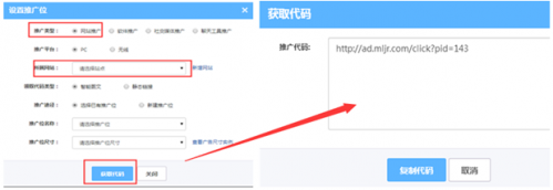 然后,根据实际需求,将推广的物料进行综合的设定,复制推广代码,将此代码加入到网站指定的推广位即可完成所有的添加步骤。