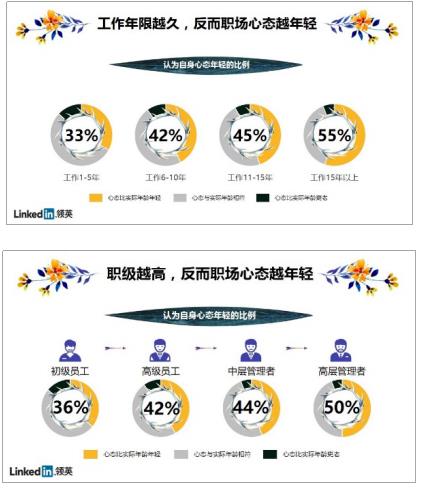 从“你被同龄人抛下”、“最后一批90后已成年”到“X年危机”,传递焦虑的话题总能迅速引起社会关注与热议。当今职场人竭尽全力地跟风追热点,渴望尽解永葆年轻的密码,生怕成为潮水退去后被落在沙滩上的那一个。为此,在五四青年节前夕,从“年轻”出发,全球领先的职场社交平台LinkedIn(领英)围绕当今职场人的心态展开了调查。数据发现,年轻无关年龄,一份年轻的“职场心态”才是保证不掉队的关键。工作年限越长、职级越高反而职场心态越年轻,这背后环境的影响至关重要。