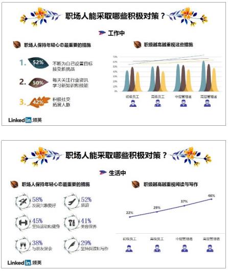 有哪些措施能够帮助职场人保持年轻的心态?数据显示:工作中,不断为自己设置目标、接受新挑战(52%),关注行业资讯、学习新知识技能(50%),以及积极社交、拓展人脉(42%)成为了职场人保持年轻最重要的措施;同时在生活中,职场人则多会选择发展兴趣爱好、旅游以及坚持运动健身。职级越高,采用这些措施的比例也越高。