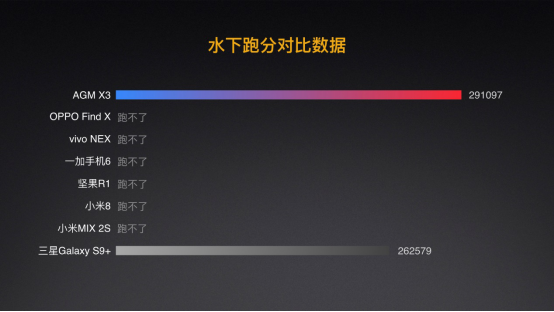 AGM X3搭载骁龙845处理器平台,和最高8+256GB的内存组合。流畅的运行大型游戏、以及多软件同时运行。安兔兔跑分更是高达29万分,由于AGM X3防水的特性,在水下也能同样跑出29万分的成绩。
