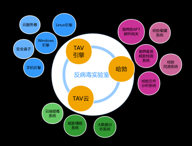 目前,腾讯安全反病毒实验室以自研TAV引擎为核心,打造了以电脑管家、手机管家、Linux管家为代表的终端安全产品,以哈勃分析系统为核心的御界防APT邮件网关、御界高级威胁检测系统等病毒防御工具,以及以TAV云为核心的大数据分析系统、威胁情报系统等漏洞监测工具,构建起了事前、事中、事后的全网安全防御体系,帮助个人及企业用户全方位对抗病毒、黑产等各种类型的网络安全威胁。