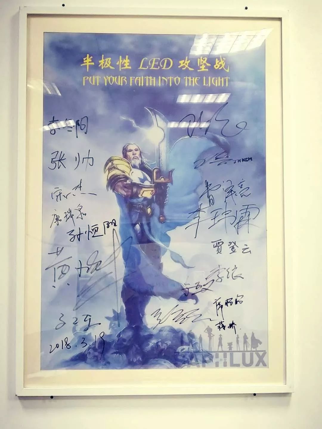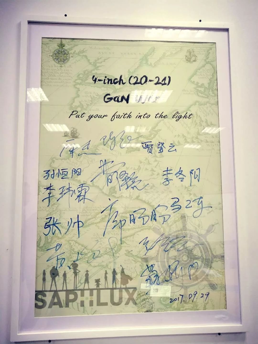 曹泽亮解释到,第一张图是纪念赛富乐斯刚刚落地西安时,我们正在研发4寸半极性氮化镓材料,第二张图是研发半极性LED,这两张图都是我们在军令状,如今产品研发成功,上面的所有签名,都为我们的产品立下汗马功劳。