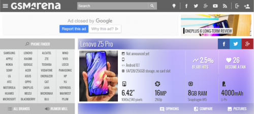 近日,外媒GSMArena在其网站上公布了联想新机Z5Pro的相关参数(https://www.gsmarena.com/lenovo_z5_pro-9349.php),并在短短时间里获得了87000多次点击,同时有不少外国网友表示已成为联想Z5Pro的粉丝,迫不及待想入手一台。