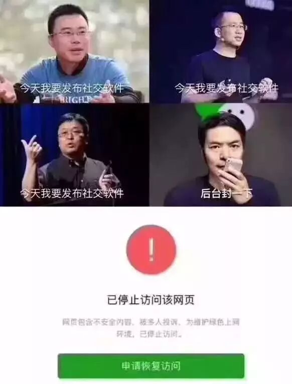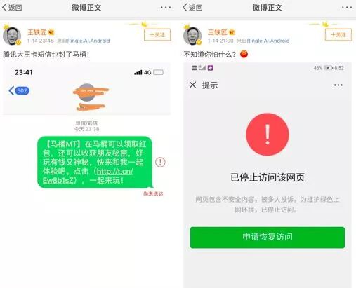 在提前上线造势之后,马桶MT和聊天宝在发布当天全部遭遇微信的封杀。主打匿名社交的马桶MT的分享链接遭到微信后台屏蔽,页面显示“已停止访问该网页”;腾讯大王卡短信也被曝屏蔽了“马桶MT”。