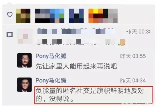 腾讯创始人马化腾还在亲自朋友圈回应:“先让家里人能用起来再说吧”“负能量的匿名社交是旗帜鲜明地反对的,没得说”
