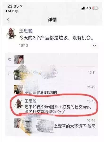 真正的好产品是用户认可的产品,与“爆炸”的数据表现相反,各界网友对于三款APP的评论确于数据表现截然不同。有“娱乐圈纪检委”“校长”称号的王思聪就曾发微博表示:“今天的三个产品都是垃圾,没有机会”并在评论中追加留言:“还不如做个INS图片+打赏的社交APP,匿名社交都是炒冷饭了”。