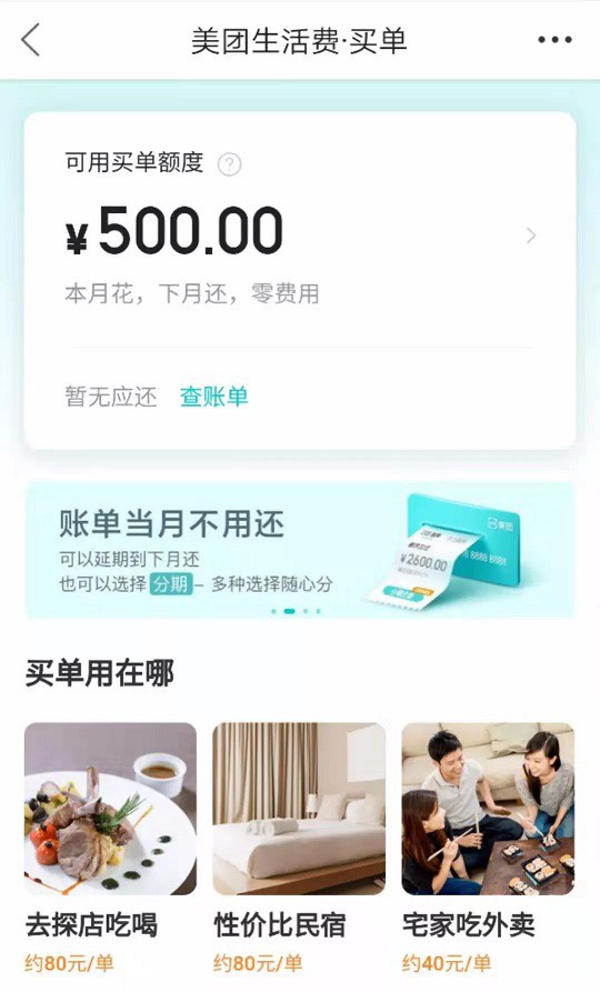 现在美团“买单”还未完全开放,只对那些经常使用美团的用户开放,而且“买单”额度根据个人账户资质有所差别,分别有500元、1000元及1500元等。这一模式跟花呗极为相似,有了花呗的成功案例,虽然“买单”现在额度小,但是相对而言风险也更小,而且美团上面的使用场景如外卖、单车、买菜、酒店等,也都是一些客单价低但是高频的消费,因此也更符合用户的消费需求。